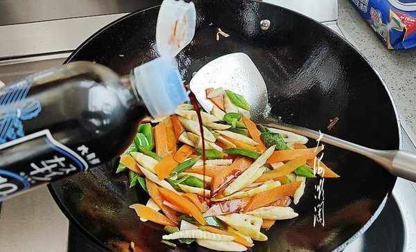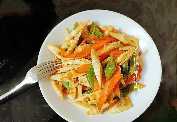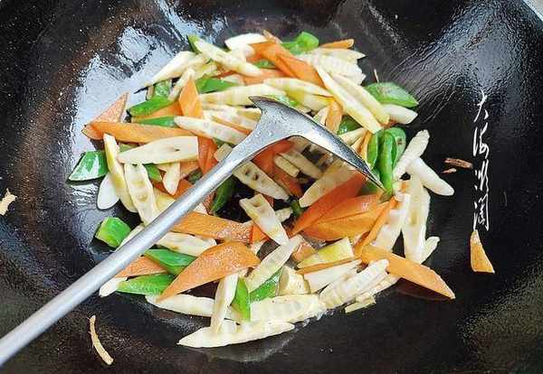 食材:新鲜笋尖250克;胡萝卜半根;青椒半个;油、葱、姜、蒜、盐、蘑菇粉、六月鲜10克轻盐原汁酱油各适量。