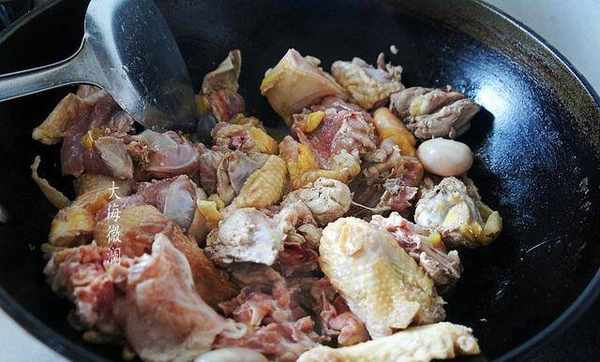 小笨鸡摘洗干净,斩成大小合适的块儿,冷水浸泡出血水,大约浸泡1小时左右,然后洗净控净水分。炒锅加热,下入控净水分的鸡块,中小火翻炒,炒至鸡块无水分为止。