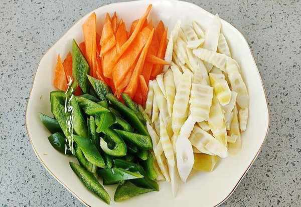 做法:笋尖洗净切滚刀片,胡萝卜去皮洗净切菱形片,青椒洗净切片。笋尖切滚刀片,胡萝卜和青椒分别切菱形片,葱姜蒜去皮洗净切末。