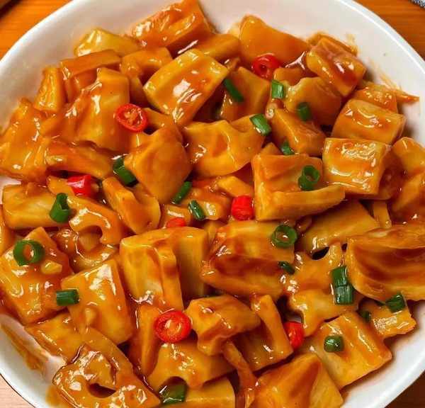 3.起锅热油,锅中放入蒜末爆炒,再放入藕丁翻炒至断生,淋糖醋汁,使藕丁均匀裹上糖醋汁后撒小米辣、葱花,出锅装盘。
