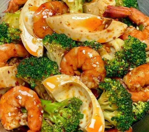 食材准备:西兰花、鸡蛋、虾、蒜、葱、白芝麻、辣椒面、食用油、生抽、香醋、蚝油、盐