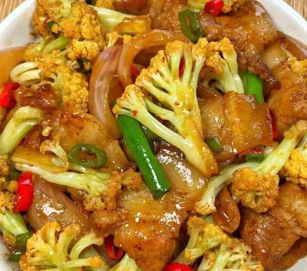 3.放入线椒、小米辣、洋葱翻炒均匀后倒入花菜,加两勺生抽,一勺蚝油,少许老抽和食盐,一勺白糖翻炒均匀,炒至花菜断生出锅装盘。