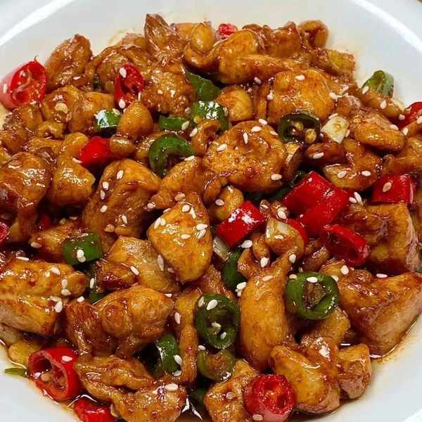 2.起锅烧油,油热爆香姜蒜,倒入鸡肉翻炒熟透,再倒入青红椒翻炒断生,加1勺老抽、半勺盐、少许花椒粉翻炒均匀,出锅前撒点白芝麻即可。