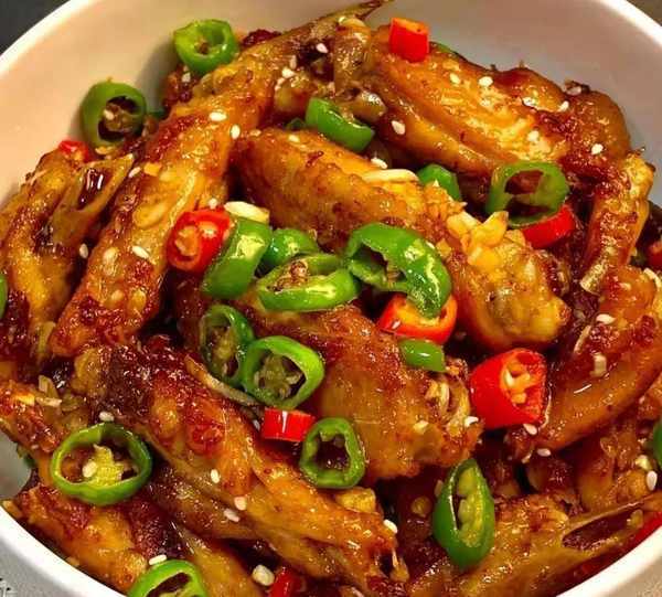 食材准备:鸡翅、蒜、青椒、小米椒、料酒、生抽、蚝油、胡椒粉、淀粉、食盐、白糖、鸡精、白芝麻