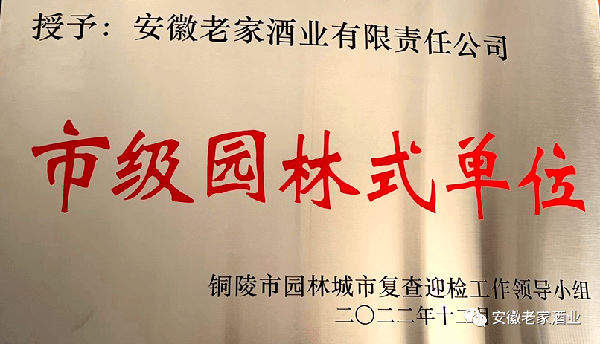原标题:打酒节:喜讯!安徽老家酒业被评为2022年度“市级园林式单位”!