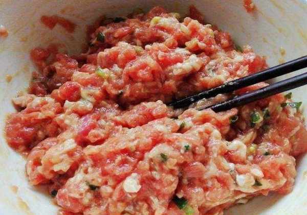 第四步:倒入肉馅搅拌均匀,最后倒入适量香油和盐搅拌均匀,成饺子馅。