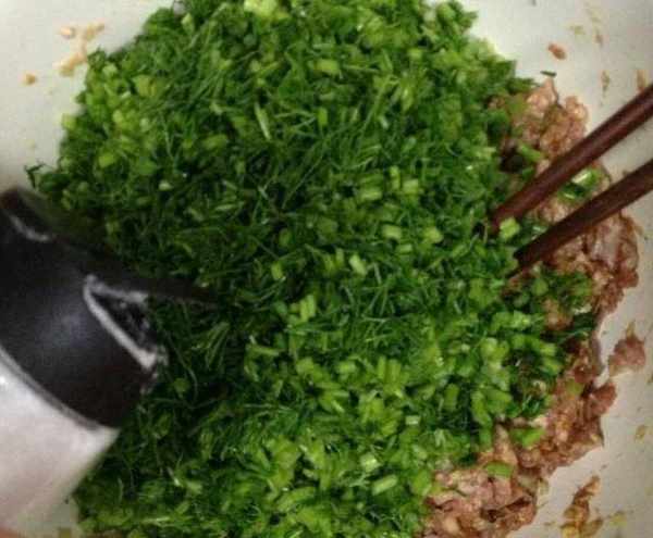 第三步:最后将剁碎的茴香倒入猪肉馅中,继续倒入适量的香油、食用油和盐,搅拌均匀即成饺子。