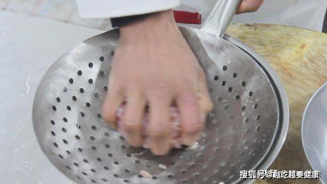 把肉丝用清水清洗后,放在漏勺里挤去水分。