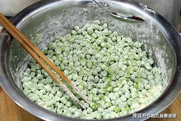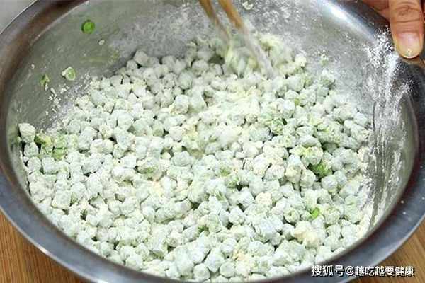 拌匀以后撒入适量的面粉,让豆角粒都裹上面粉,裹至完全干燥的状态就可以了,面粉不要过多,不然吃着发硬还容易粘。