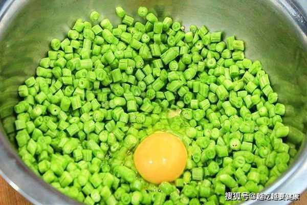 首先,准备一把洗净的长豆角,切成豆角粒放在稍微大点的盆中,打入一个鸡蛋用筷子搅拌,加鸡蛋主要是为了增加营养、增加松软的口感,同时还能防止粘连。