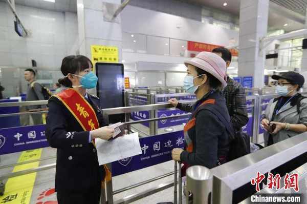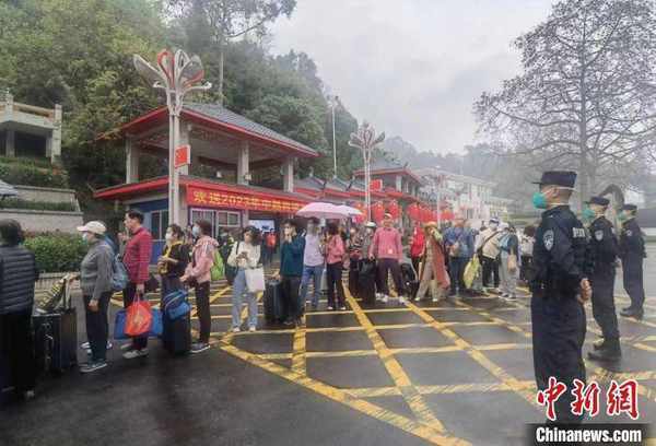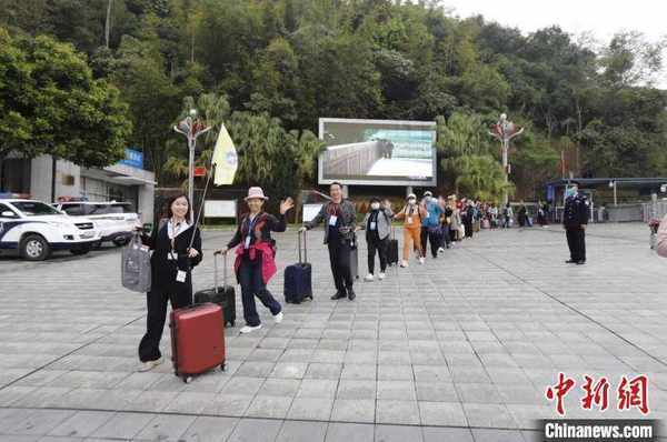 图为首批旅行团在友谊关口岸排队等候出境。 周日 摄