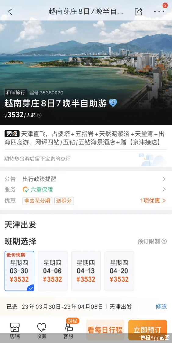 第二批出境团队游国家放开后,越南成为了最先恢复的目的地之一。除了首日出发的团队外,广之旅赴越南飞机往返跟团游也将于3月24日启程,该团将前往胡志明市、美奈、芽庄等地。