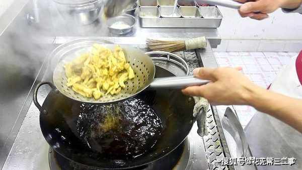5.下面,我们把鸡肉过油炸一下,锅内烧油,油烧至5成热,油面上微微冒烟,倒入鸡胸肉,保持中火,炸20秒捞出鸡胸肉。