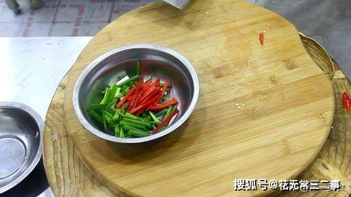 小葱一把,切成段,红椒去籽后切成丝,放在盘里备用。