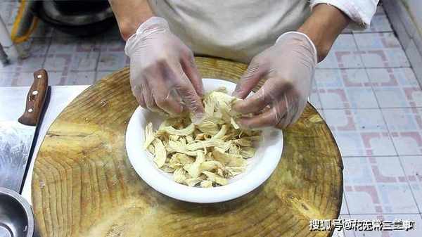 4.10分钟后,捞出鸡肉,这个时候的鸡肉已经煮熟了。用凉水浸泡一会,捞出控水。然后把鸡肉撕成小块放在盘里备用。