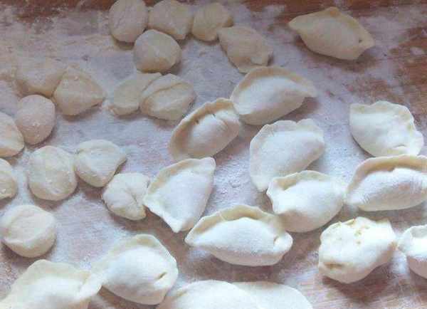 第五步:将长条切成较小的饺子,擀成中间厚边薄的饺子皮,取适量馅料放在皮中央,揉紧包好.饺子。