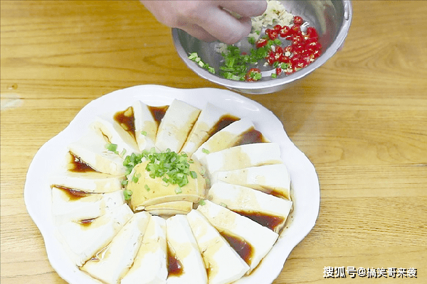 然后,我们把蒸好的豆腐取出来。控出里面的汁水,均匀淋上调好的料汁。撒上葱花、蒜末、小米辣,再加几粒青花椒,等待激油。