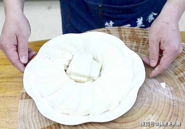 把嫩豆腐切成一厘米左右的厚片,做这道菜,用嫩豆腐、老豆腐都可以。嫩豆腐口感细腻, 老豆腐蒸出来更香。