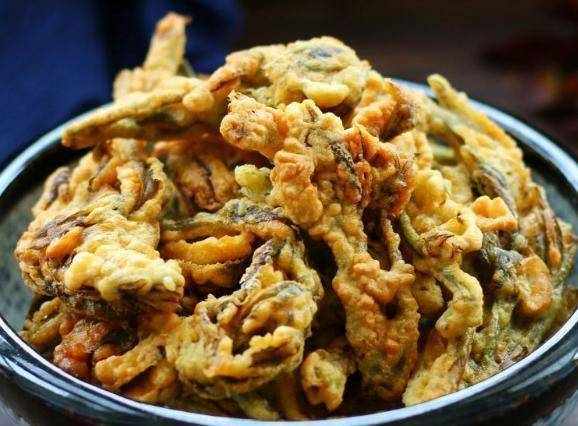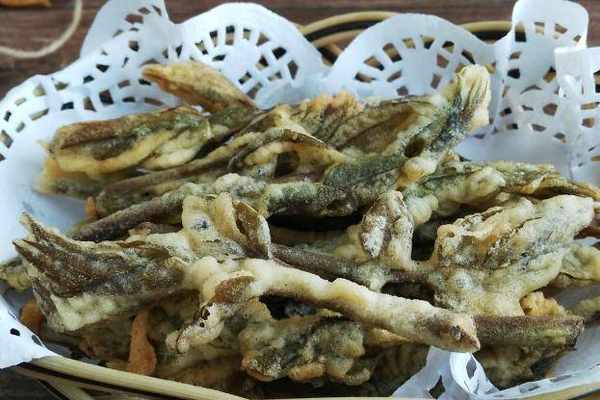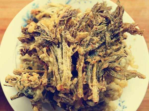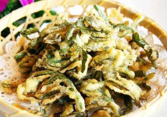 第六步:煮好后,放入裹好面糊的香椿,用中火慢慢煎至香椿呈金黄色,即可食用。