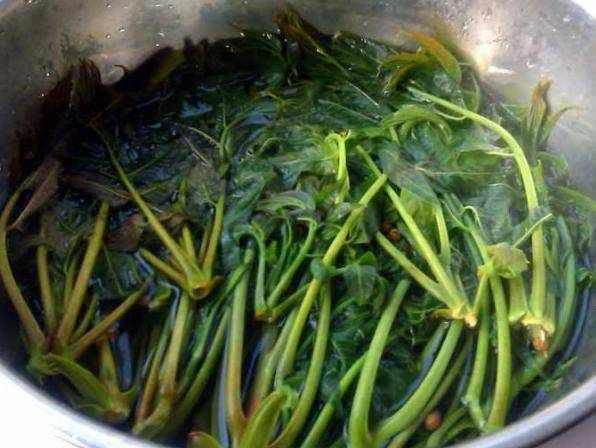 第二步:锅中加入冷水烧开,倒入药明用水焯至药明死,捞出药明泡冷水。
