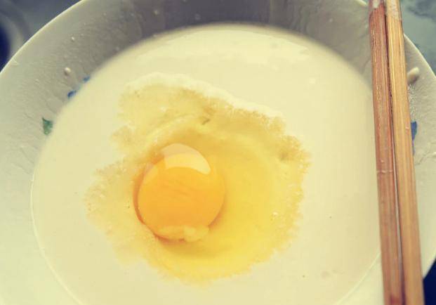 第四步:将鸡蛋打入碗中打匀成蛋液,不断加入少许水搅拌均匀,然后倒入适量面粉搅拌成面糊。