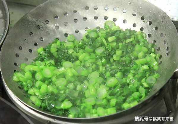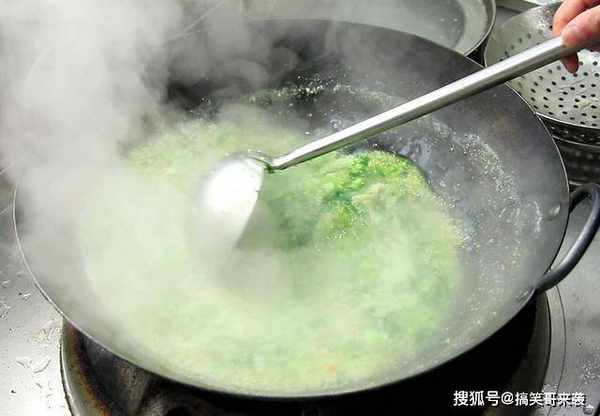 2.起锅烧水,锅内加入少许的植物油和一勺食盐,水烧开以后把芥兰倒入锅中,快速焯水20秒钟,去一下苦涩味,把芥兰倒出用凉水冲洗几下,以免芥兰回软,导致口感不够清脆。