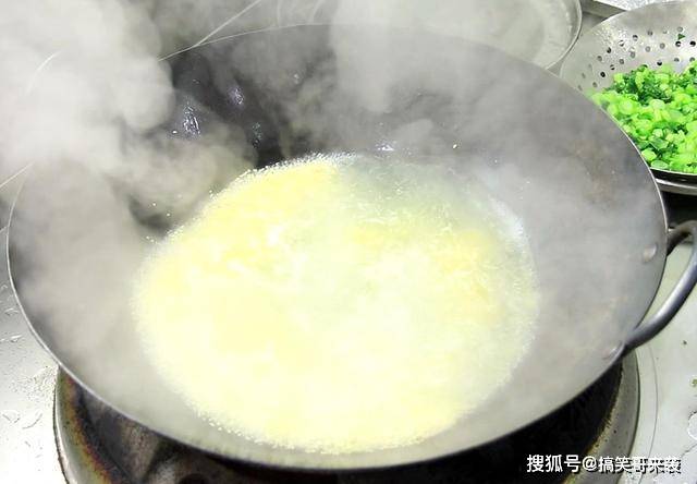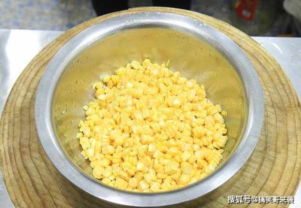 3.锅内烧水,放入食盐和鸡粉入底味,再加入一点植物油,防止玉米中的营养成分流失,把玉米粒倒入锅中,水烧开以后把浮起来的玉米皮打干净,以免影响口感,大约煮2分钟,玉米断生以后倒出控水备用。