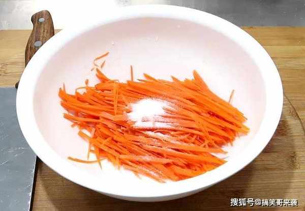 2.准备胡萝卜一根,削净外皮,斜刀切成细丝,加入食盐2克,抓拌均匀腌一会儿,把胡萝卜出一下水,使胡萝卜变软。