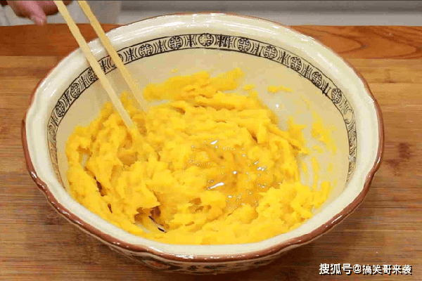 2.把红薯倒入盆中,根据自身的口味加入适量的白糖,趁热把白糖搅化,把红薯搅成细腻的红薯泥,加入蜂蜜10克,蜂蜜能使做出的红薯饼更加香甜,搅拌均匀以后,静置晾凉备用。