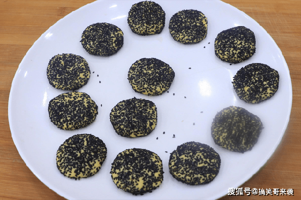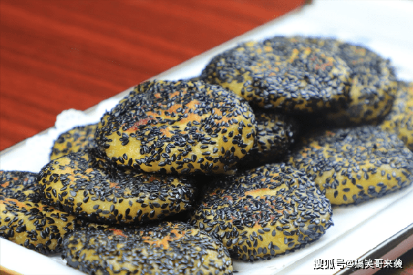 6.把烙好的红薯饼摆放在盘中,就能上桌食用了,营养丰富的黑芝麻散发着淡淡的清香,混着红薯的香甜,让人食欲大增。