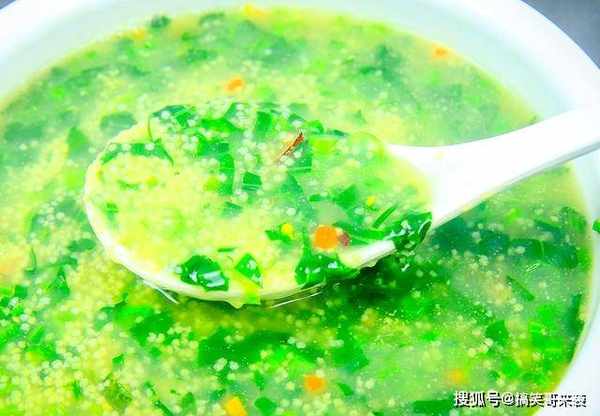 5.小米熬开花以后,把芥兰倒入锅中搅拌均匀,煮至小米羹微微烧开,再勾入半勺芡粉,把小米羹调得稠一点,用勺子快速搅匀小米羹,再次煮开以后即可出锅,这道清淡养胃的青菜小米羹就做好了。