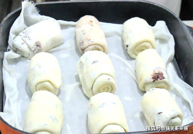 6.放上适量的红豆泥,从底部开始向上裹,裹成条状以后压扁,擀成舌状卷起来,把接口处捏实,红豆卷就做好了,用细布盖住再发酵10分钟,二次发酵红豆卷更有弹性暄软。