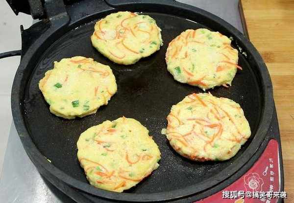 5.在电饼铛里,均匀刷一层植物油,电饼铛烧热以后,把面团拍成薄厚均匀的小饼,逐个贴在锅内,一面煎定型后翻过来煎另一面,盖上锅盖煎40秒钟再次翻面。