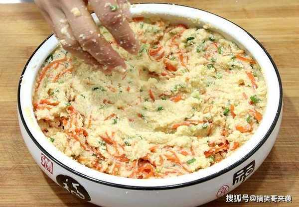 4.准备一个大盆,倒入豆渣,把胡萝卜抓软,挤压出水分放入盆中,倒入调好味的小葱,打入2个鸡蛋,把所有原料抓拌均匀,加入面粉50克继续抓拌成团。