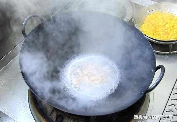 5.锅内烧油,充分滑锅以后倒出热油加入凉油,把青红椒等小料倒入锅中翻炒出香味,放入胡萝卜丁翻炒30秒钟,胡萝卜断生以后把虾仁和玉米粒倒入锅中,翻炒均匀1分钟。