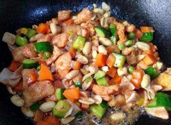 第七步:倒入黄瓜和花生,炒一分钟左右,大火捞出汁,即可食用。
