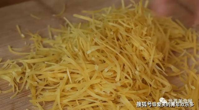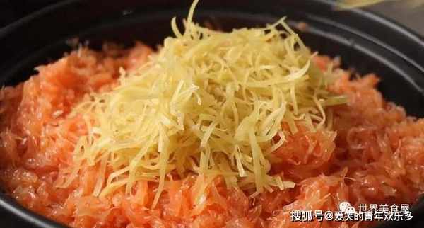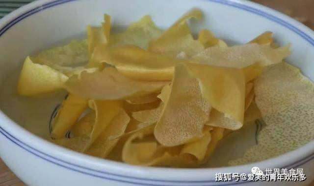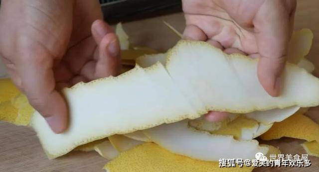 5、随后将柚子皮捞起来挤干水分,将它切丝备用。