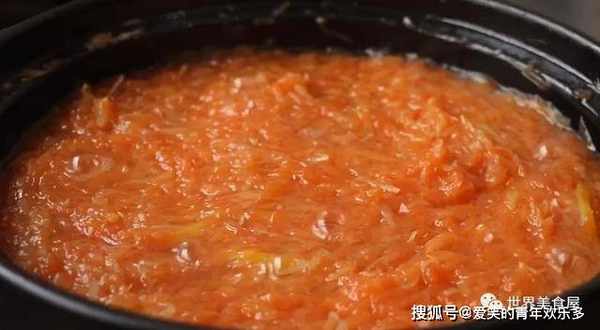 7、加入一大碗清水,一边熬制,一边用铲子捣碎,这个步骤,是为了去掉果肉的苦涩味,不然会很苦。
