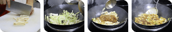 ③锅中加少许油,下葱爆香,下肉末炒散,下包菜炒软后,加入盐,鸡精,糖,老抽2g,生抽,耗油,加水40g,煮沸后加入方干条,粉丝,用锅铲不停的翻炒2分钟,出锅。
