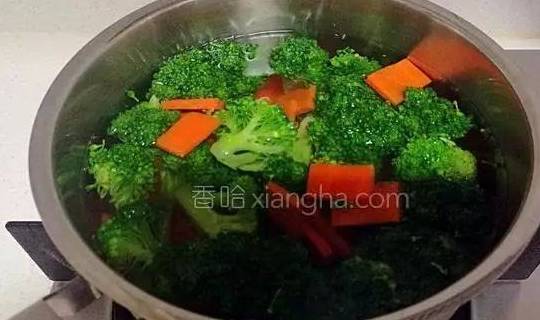 2.锅中水烧开,将西兰花和胡萝卜焯水后捞出控水。