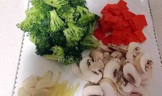 烹饪步骤:1.准备食材,口蘑洗净切片,胡萝卜切小块,西兰花撕小朵,姜切丝,蒜切片。