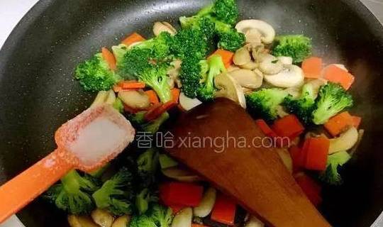 4.待汁收干,调入生抽,接着放入西兰花和胡萝卜同炒,拌炒均匀后,调入少许盐即可。