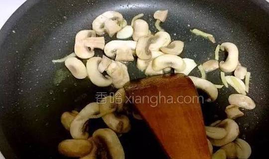3.锅中油烧热,将姜和蒜放进去爆香。接着放入口蘑翻炒,调入少量盐,加快囗蘑出水,口蘑出水后,大火不断的翻炒收汁。