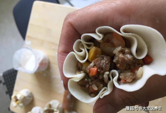 第三步:面粉加水和成面团,盖上保鲜膜,密封静置半小时。面团醒好后,拿到砧板上揉。加入适量的馅料,不收口捏出形状。