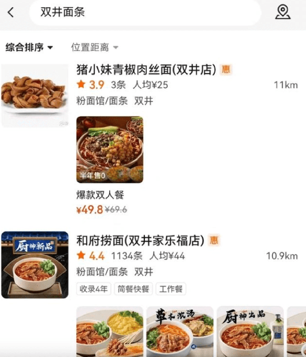 记者以北京市东三环双井为定位,在某平台上搜索“面”,和府捞面双井家乐福店畅销的“双人畅爽吃面”套餐优惠过后82.9元,而猪小妹青椒肉丝面双井店爆款双人餐优惠后仅49.8元;和府捞面厨神出品重磅单人餐优惠后41.9元,最便宜的草本浓汤养生面优惠后还31.5元,而晋宝章大同刀削面双井店招牌必点单人餐优惠后24.5元,晋来顺手擀面单人餐优惠后23.8元。