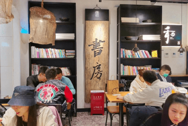 在这里就餐,感官上与“书房里的中国味”文不对题。记者看到,大约100平方米的空间,摆放70多个餐位,还有两处自助调料区供顾客免费试用。“书房”里很多书柜闲置,一些书也显得陈旧,内容质量也不高。即便在中午12点前生意最火爆的时候,也没有发现消费者在饭前、饭中、饭后看书。