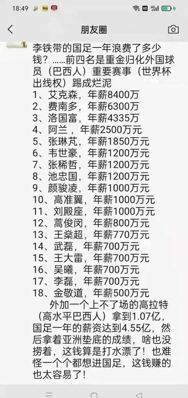 我们男足的高薪待遇,是全民皆知的,动辄都是千万年薪,但拿了如此高薪的我们男足,却频频在赛场上失利,早早被拒绝在世界杯赛场上。