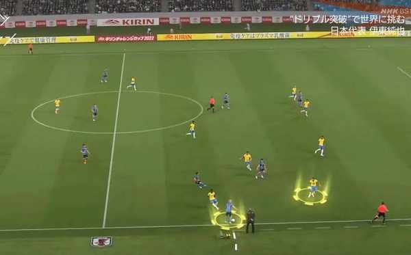 NHK将伊东纯也作为分析对象,这名球员技术细腻,擅长盘带,有强大的一对一突破能力。但伊东被巴西球员完全限制住了。他们发现,伊东纯也视野不够宽阔,在控球过程中,完全忽视了其他球员有抢断的可能。他有时过于自信,以为自己已突破防守,但不能预判对方在他传中时,会同步起脚化解威胁。