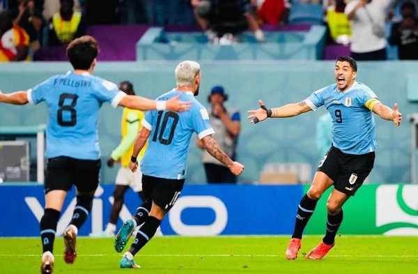 第31分钟,苏亚雷斯接努涅斯头球直接挑传后点,德阿拉斯卡埃塔凌空抽射破门;上半场乌拉圭队2:0领先加纳;
