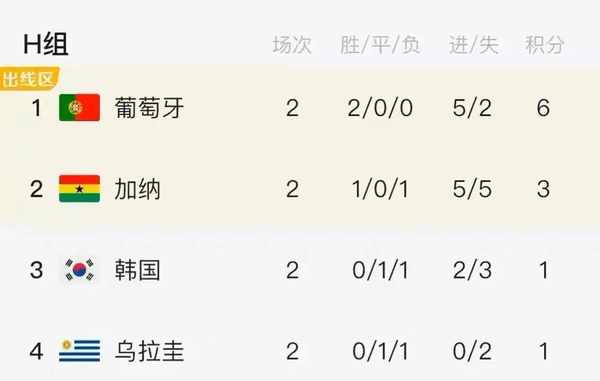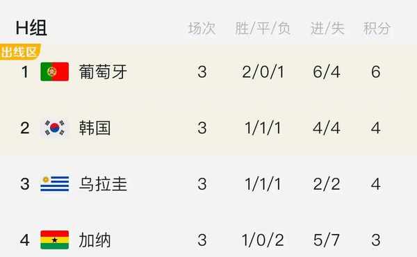 H组最终积分排名中,葡萄牙2胜1负积6分,以小组第一出线;国外队和乌拉圭队都是1胜1 平1负,净胜球都为0,但国外队进球数更多,最终国外队排名小组第二,幸运晋级16强,1/8决赛将与夺冠热门巴西直接对决!